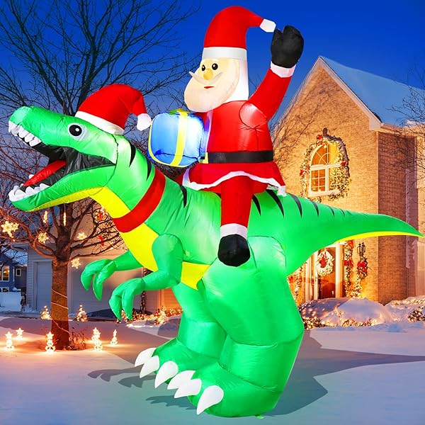 Amazon Com Turnmeon 10 Ft Long Christmas Inflatables Dinosaur Outdoor Decoration Lighted Blow Up Santa Dino Holds Merry Xmas Wreath With Tether Stakes Led Lights Xmas Decor Holiday Yard Lawn Garden Home Party
